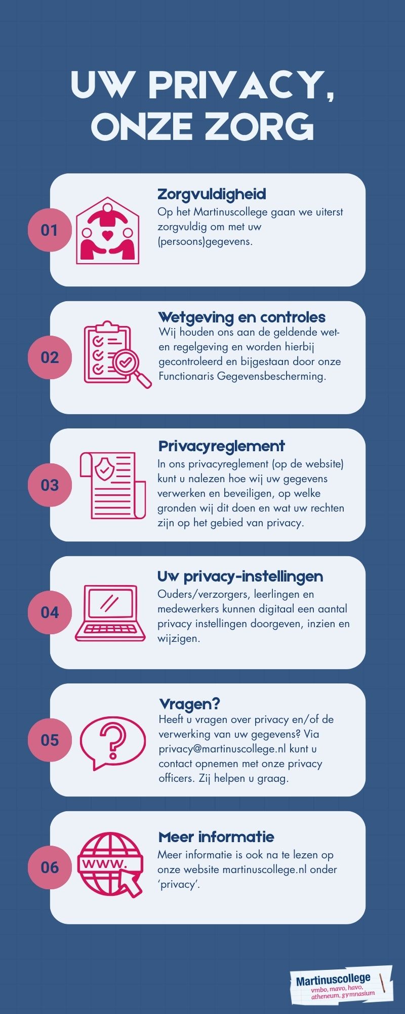 Op het Martinuscollege gaan wij zorgvuldig om met persoonsgegevens van betrokkenen wiens gegevens worden verwerkt (medewerkers, leerlingen, ouders, bezoekers of andere relaties). Bij de verwerking van persoonsgegevens houdt de school zich aan de van toepassing zijnde wet- en regelgeving, waaronder de Algemene Verordening Gegevensbescherming (AVG), de Uitvoeringswet AVG en de onderwijswetgeving.